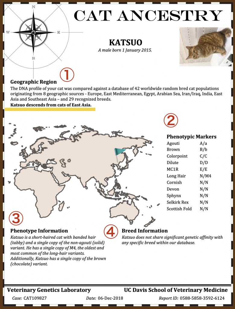 肥満タイプや病気のリスクなどを調べる遺伝子検査が一般的になっていますが、猫でも同じような検査をすることができます。UCデービスの獣医学科にある獣医遺伝子研究所(Veterinary Genetics Laboratory)ではメインクーンの心臓病(HCM)や、ペルシャの腎臓病(PKD)を唾液と口の中の細胞をサンプルすることで調べることができます。検査項目の中に”猫の祖先”というものがあり、前々から気になっていたので、私の猫の唾液をサンプルし、提出してみました。ちなみに検査費用は120ドルでした。