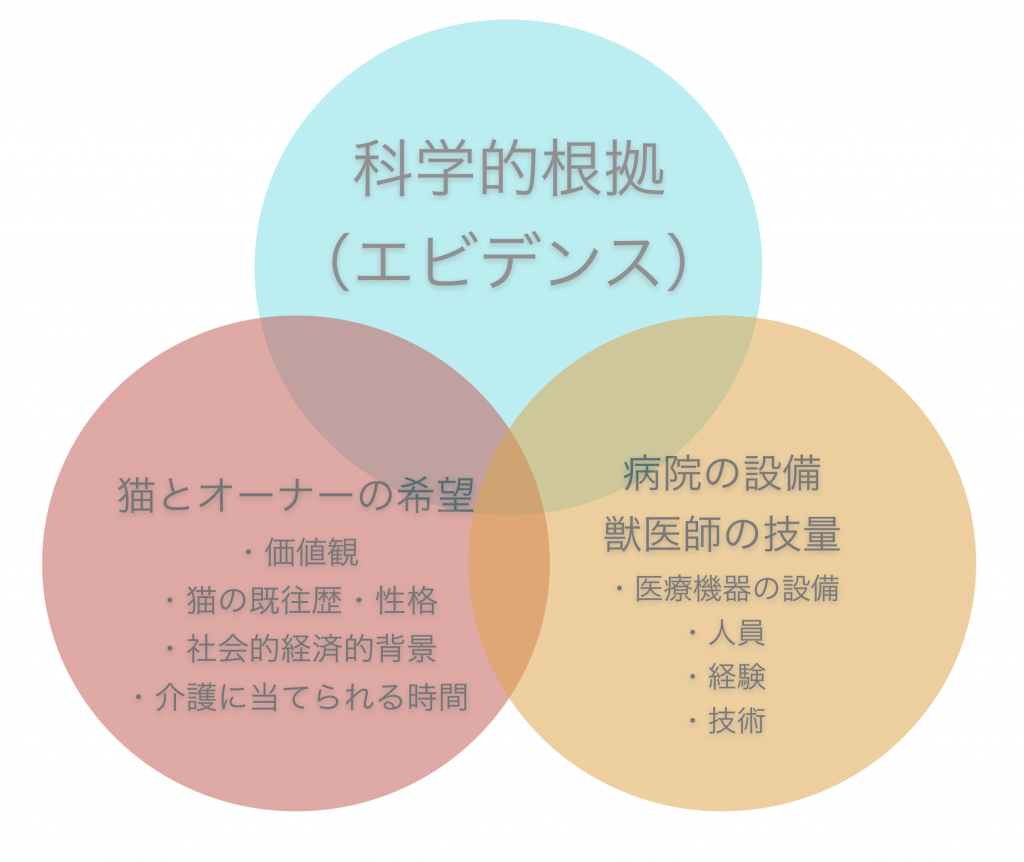 EBMは単に「エビデンスのある治療を行いましょう」ということではありません。患者(私たちの場合は猫)の状態、そして飼い主さんの希望をヒアリングした上で、エビデンスを元に最適な医療を選び、猫と飼い主さんの幸せを支える、ということがEBMです。エビデンスを①としたら、②猫とオーナーの希望、③病院の設備・技術の3つを組み合わせて治療を行うのが「根拠に基づく医療」です。