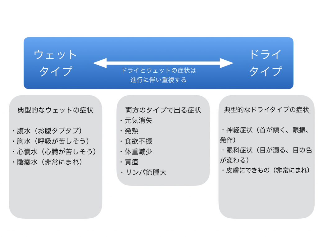 ウェットタイプ:胸水、腹水に加え心囊水(心臓の膜に水がたまり心臓の動きを邪魔する)。胸水であれば呼吸困難、呼吸数の増加が見られます。腹水では腹部の膨満感(水が入っているたぷたぷ感)、重度になると横隔膜の動きを邪魔し呼吸困難が見られます。心囊水では心拍数の増加、呼吸数の増加が見られます。