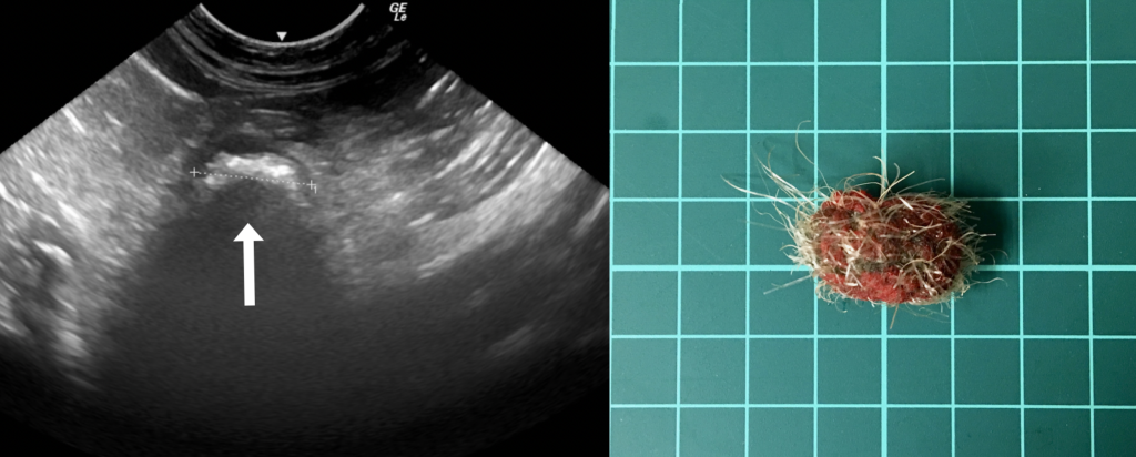 コメント:超音波検査で腸管に何かが詰まっている像が確認されました。超音波が物体にぶつかると、その先に届かないため左図のように画面が黒くなります。小腸にがっちり嵌っていたため、開腹して切除しました。詰まっていたのは遊び尽くされたおもちゃの先端でした。