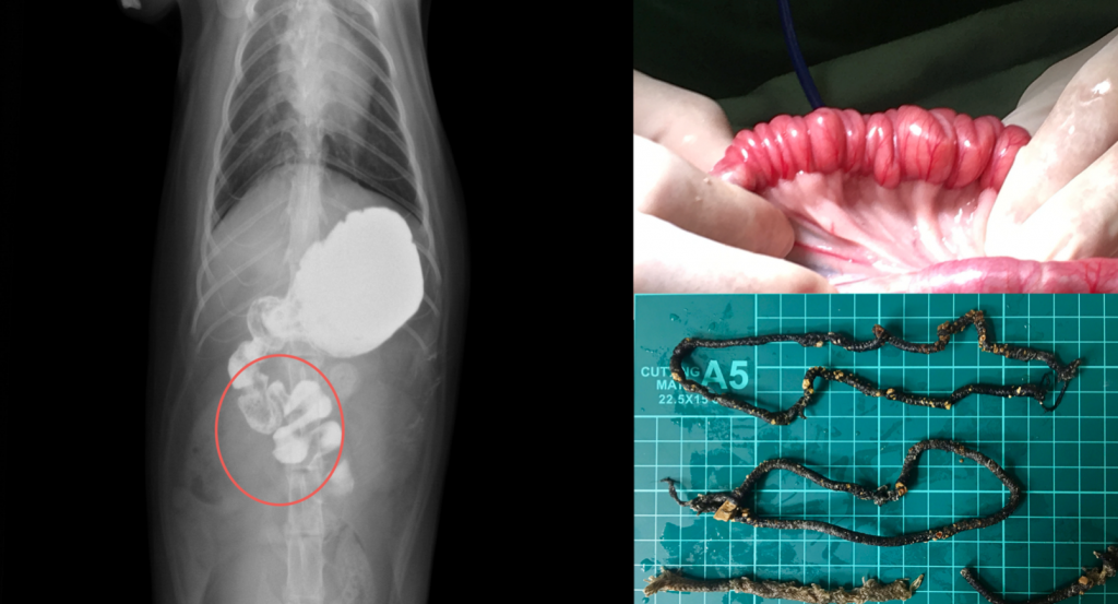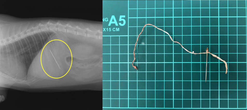 コメント:より細いひも状異物で、先端にボールがついてました。発見が遅かったため、一部消化管に穴が空いてました(左図:黄色丸)。紐があるにも関わらず、なんども消化管が動いて引っ張られるとノコギリのように腸を裂開させてしまいます。これは細い糸の方が起こりやすいので、細いひも状異物は危険性が高いです。