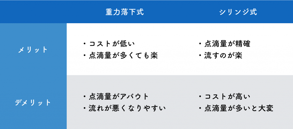どちらもメリットとデメリットがありますが、コストの面で重量式を先にオススメすることが多いです。シリンジは50mlシリンジだと最大60ml以上までしか点滴できず、それ以上は2本目に取り替える手間があります。また100mlシリンジも流通していますが、大きくて押すのが大変なので当院ではあまり使っていません。