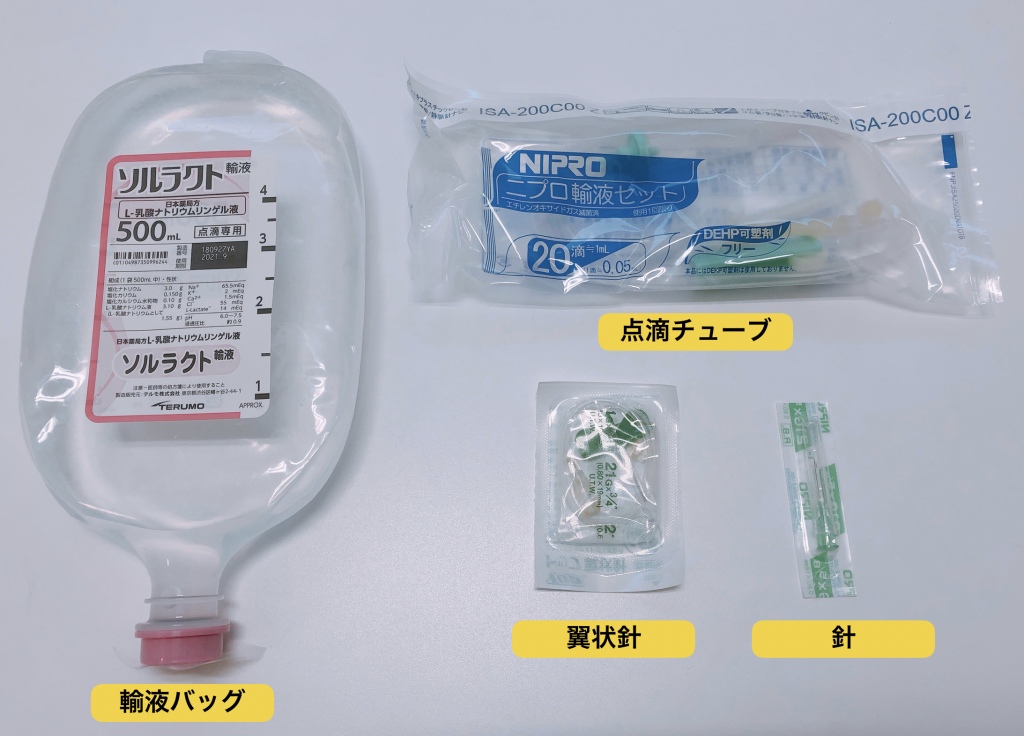 ①点滴バッグ:乳酸リンゲル、もしくは生理食塩水が使われることが殆どです。容量は様々で100ml~1000mlぐらいまで幅があり、1回何ml点滴するかによってサイズが異なります。