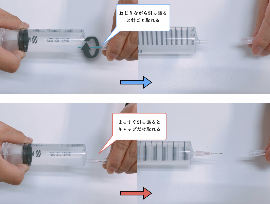 針はまっすぐ引くとキャップ(蓋)が取れ、回しながらとると根元から外れます