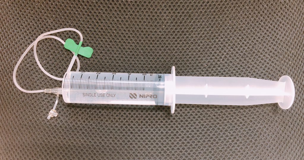 まずは皮下点滴に必要な道具として点滴する液体、針、そしてそれを繋ぐチューブが必要になります。チューブは注射器を使うか、重力落下式を使うかによって2種類あります。