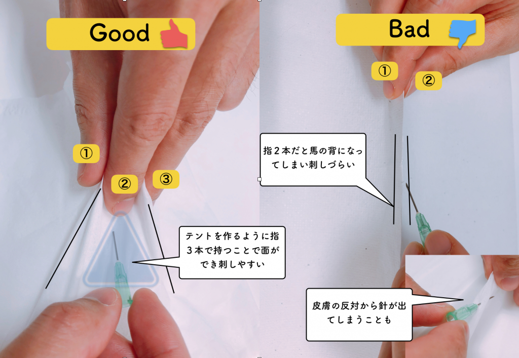 針穴を上むきに向け、皮膚に垂直に刺します。どうしても筋肉に刺してしまう恐怖心があるので針を寝かせてしまいがちですが、針の長さは5/8インチ(16mm)または1/2インチ(13mm)ですので、しっかり皮膚を引っ張っておけば根本まで刺入しても、下の筋肉には当たらないはずです。角度を意識して皮膚に対して垂直に刺しことで抵抗が少なく、痛みも少なくなります。
