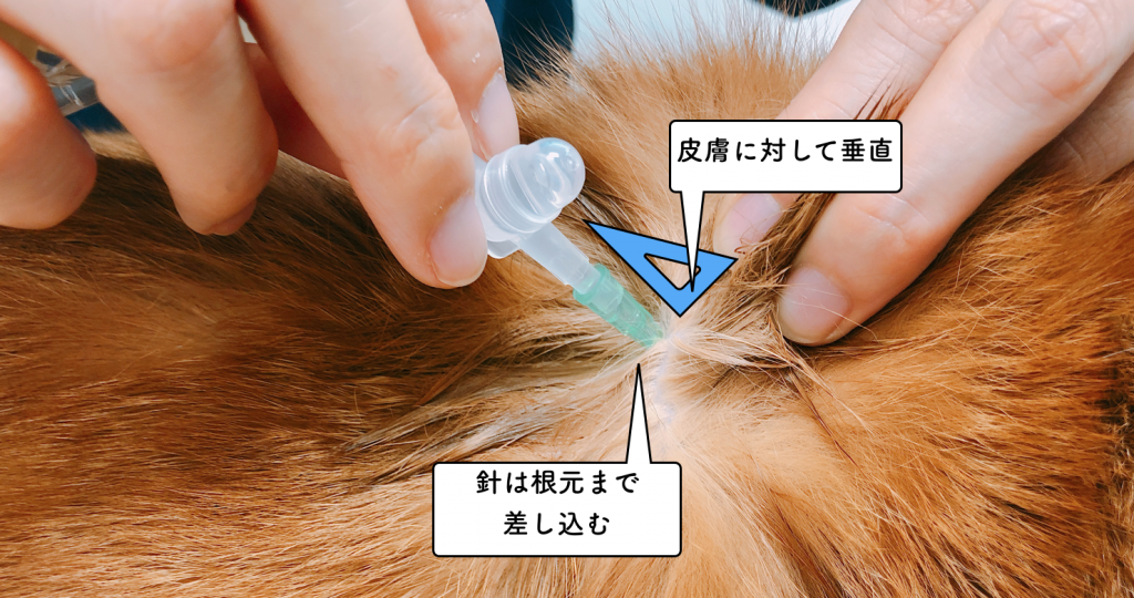 刺し場所は首の付け根ですが、肩甲骨をランドマークにするとわかりやすいです。肩甲骨の前後どちらに刺しても良いですが、経験的に後ろの方が嫌がらないことが多いと感じます。