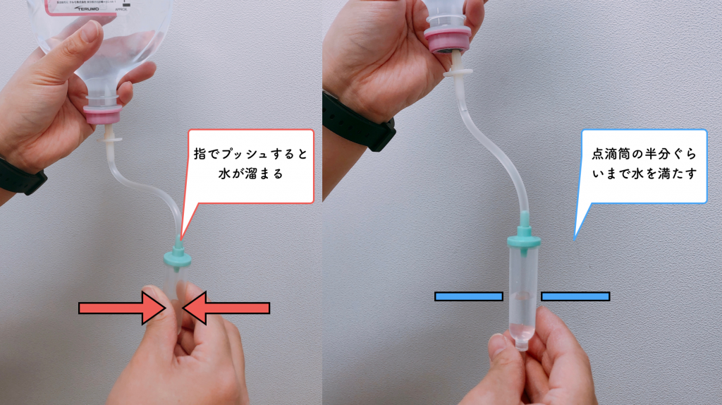 4.最後に点滴を高い位置にかけたまま、クレンメを開けると重量でチューブの中に水が流れ始めます。先端から水が出て、空気が完全に抜けたら準備終了です。