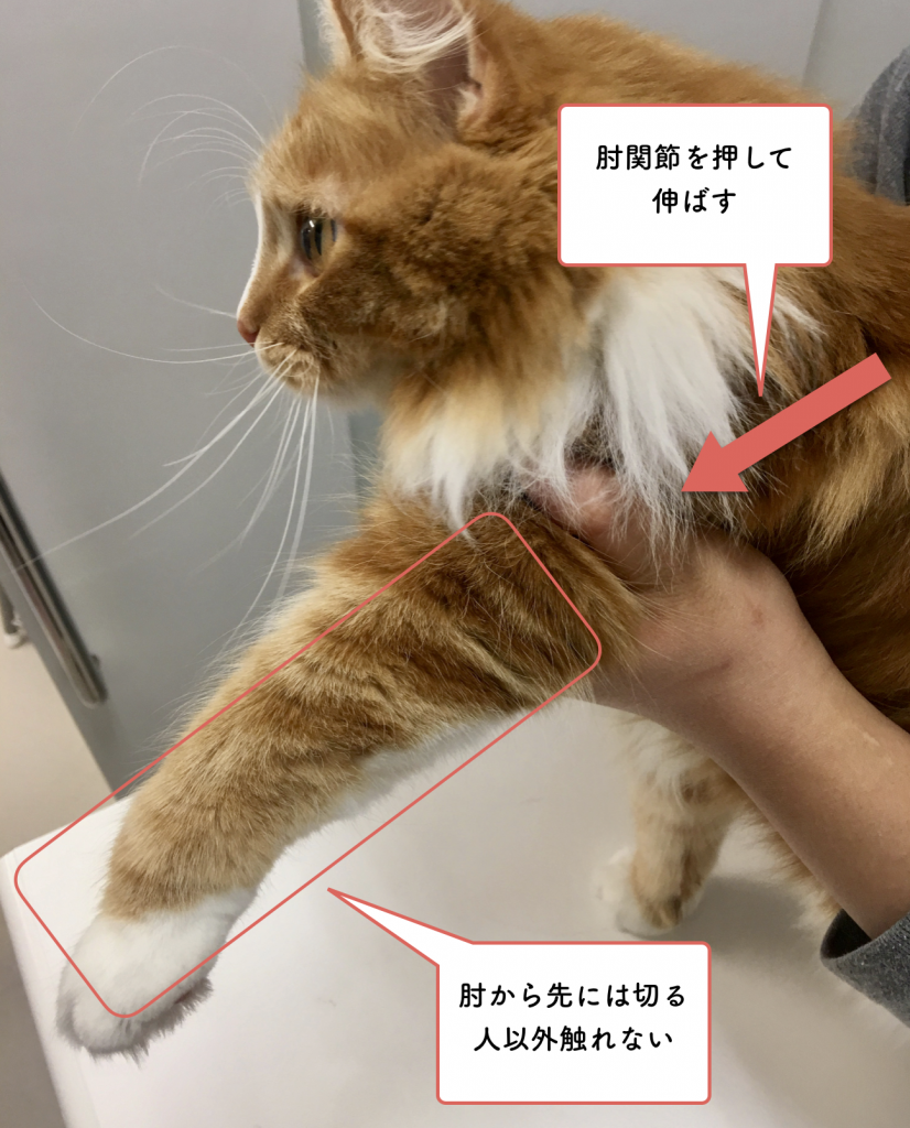 多くの猫は前足の方が嫌がるため、先に後ろ足を切ります。後ろ足は関節の可動範囲が狭いので体勢を変えて切ります(後述)。